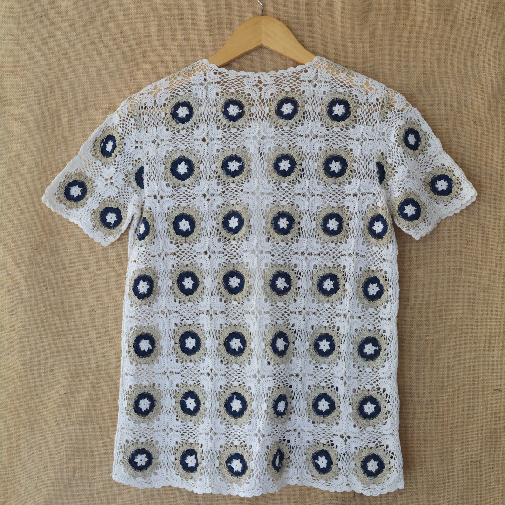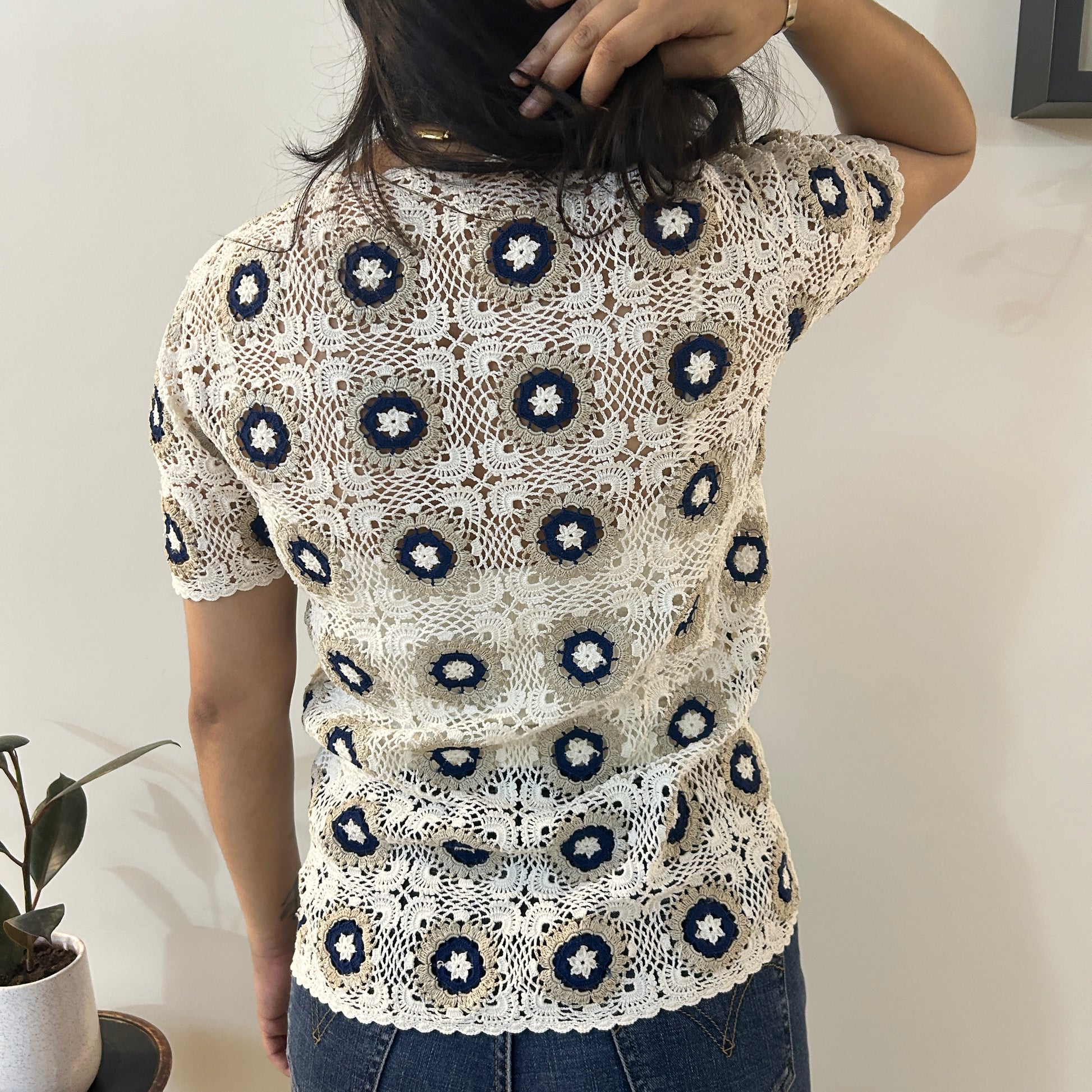 Add a touch of classic elegance to your wardrobe with the Blue Floral Chequered Crochet Shirt. This unique piece features a dark blue floral chequered pattern, accented by delicate white daisies in the center, creating a timeless and chic look.
