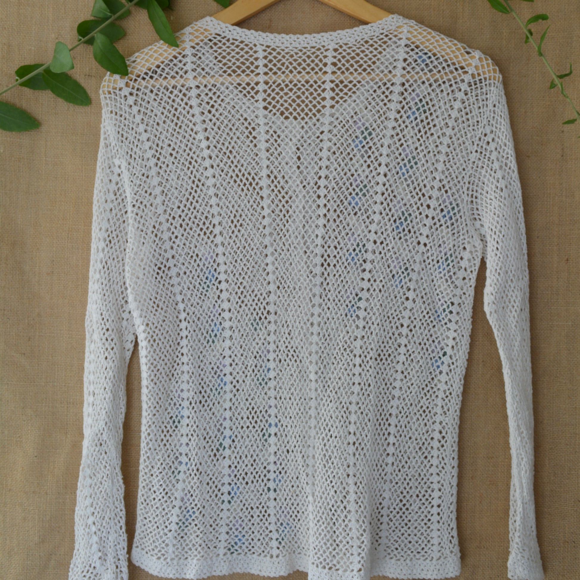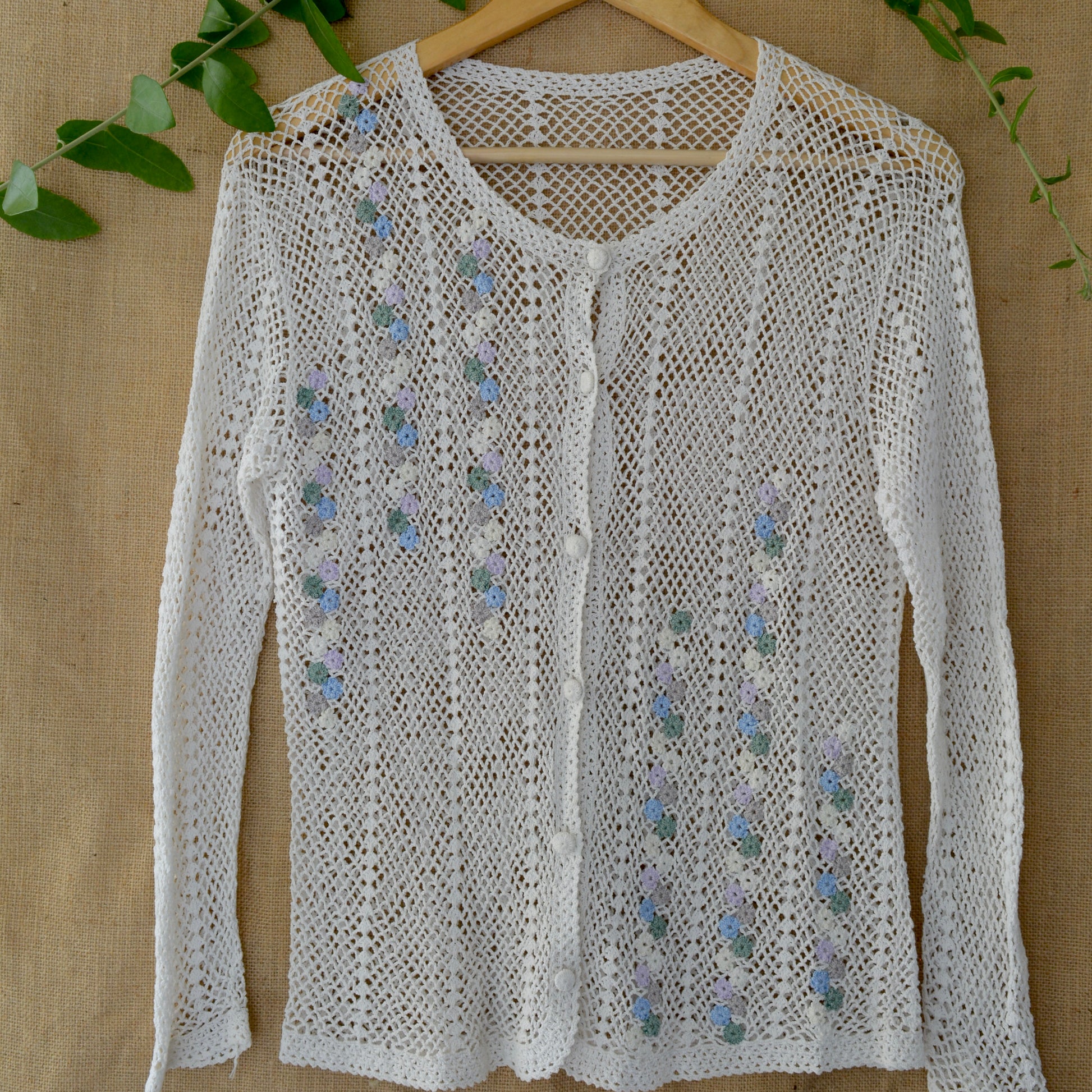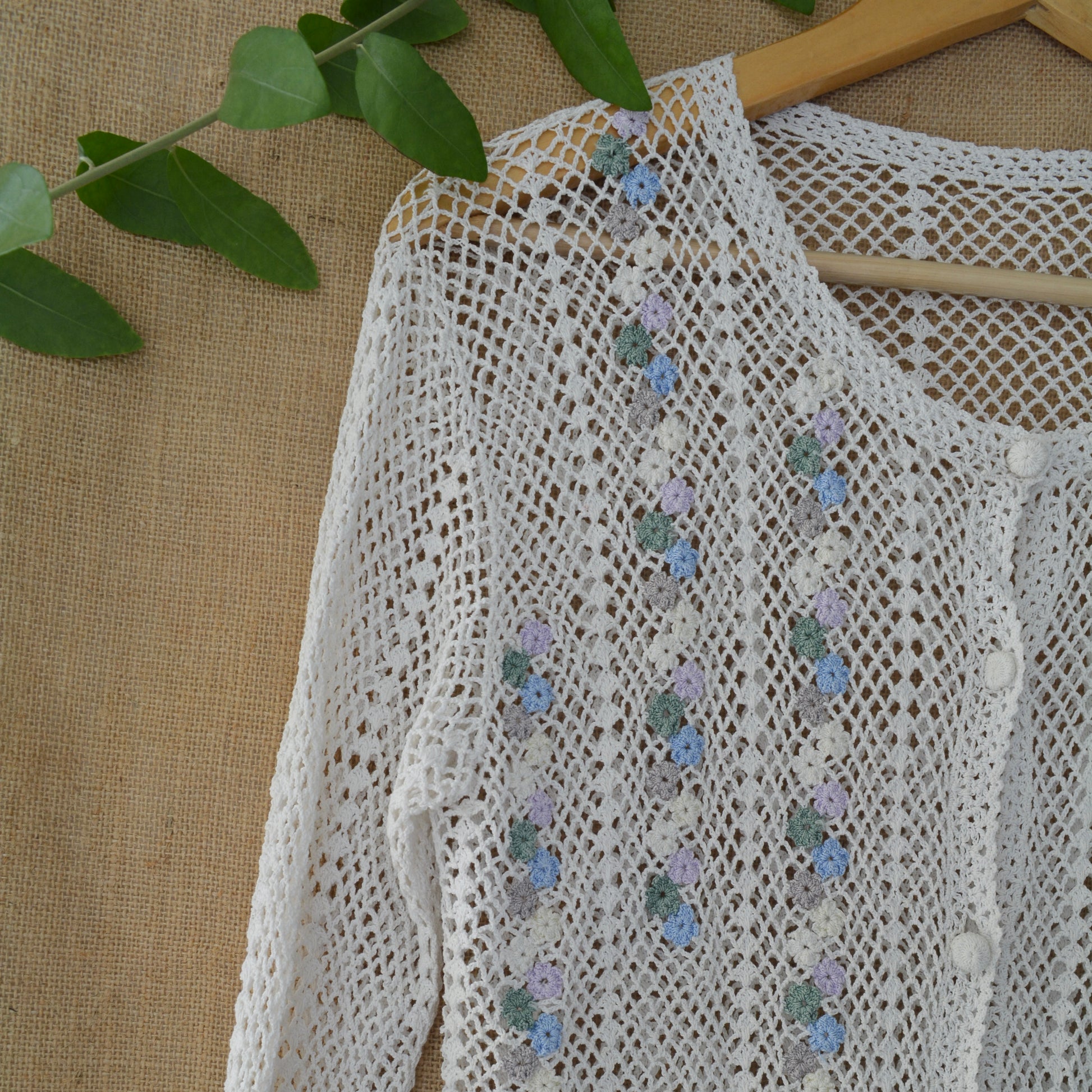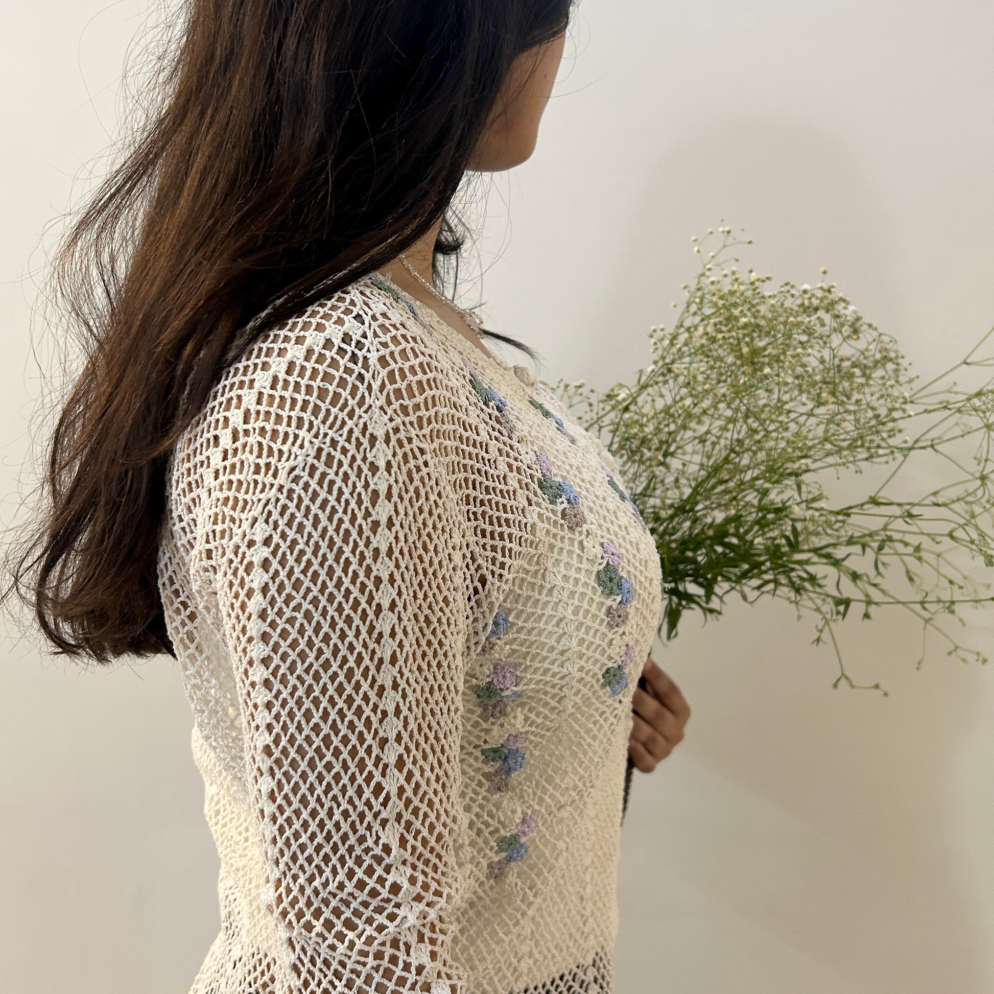 Step into a world of delicate beauty with the Daisy Fields Crochet Shirt. This elegant top is adorned with tiny multicolor daisies, creating a whimsical yet sophisticated look.