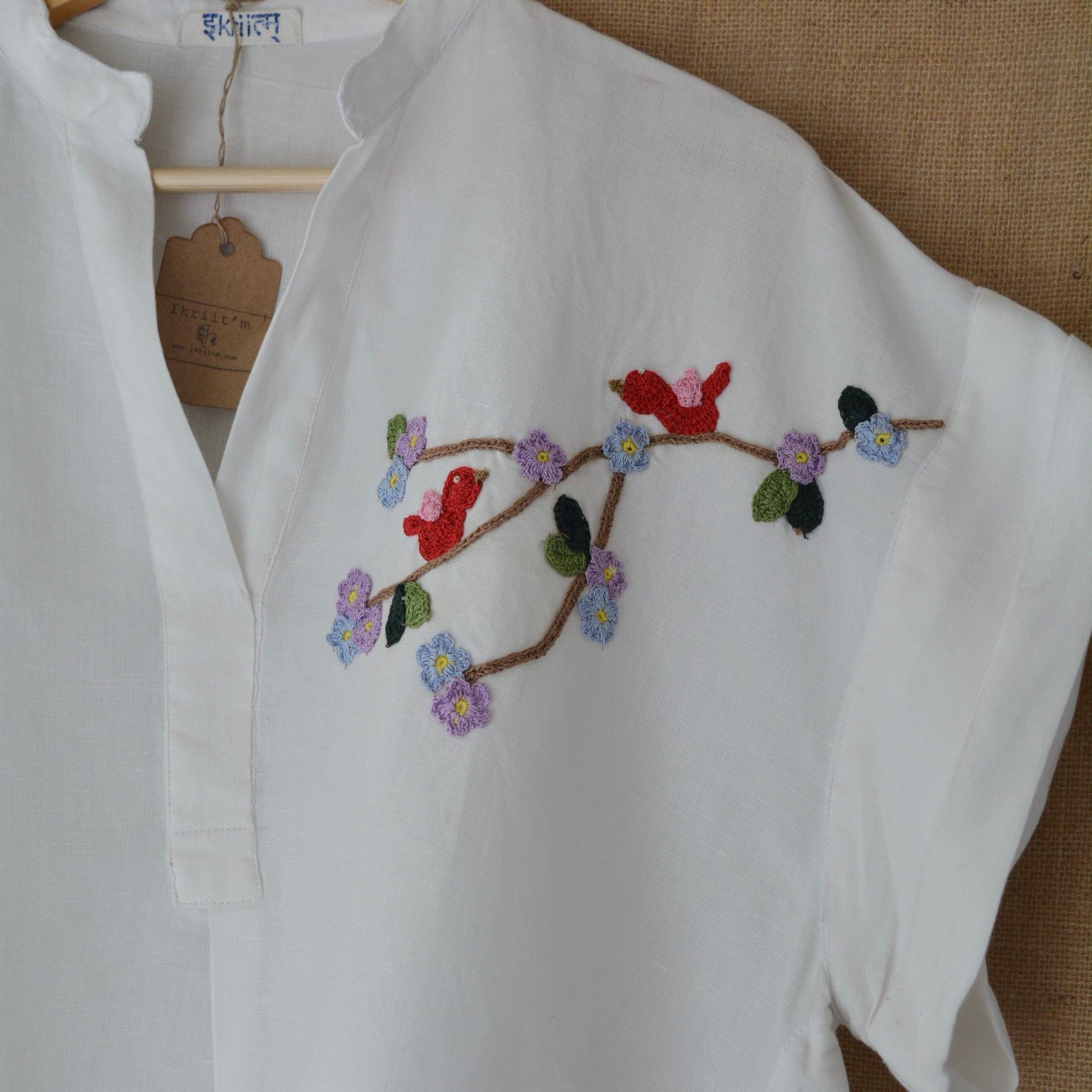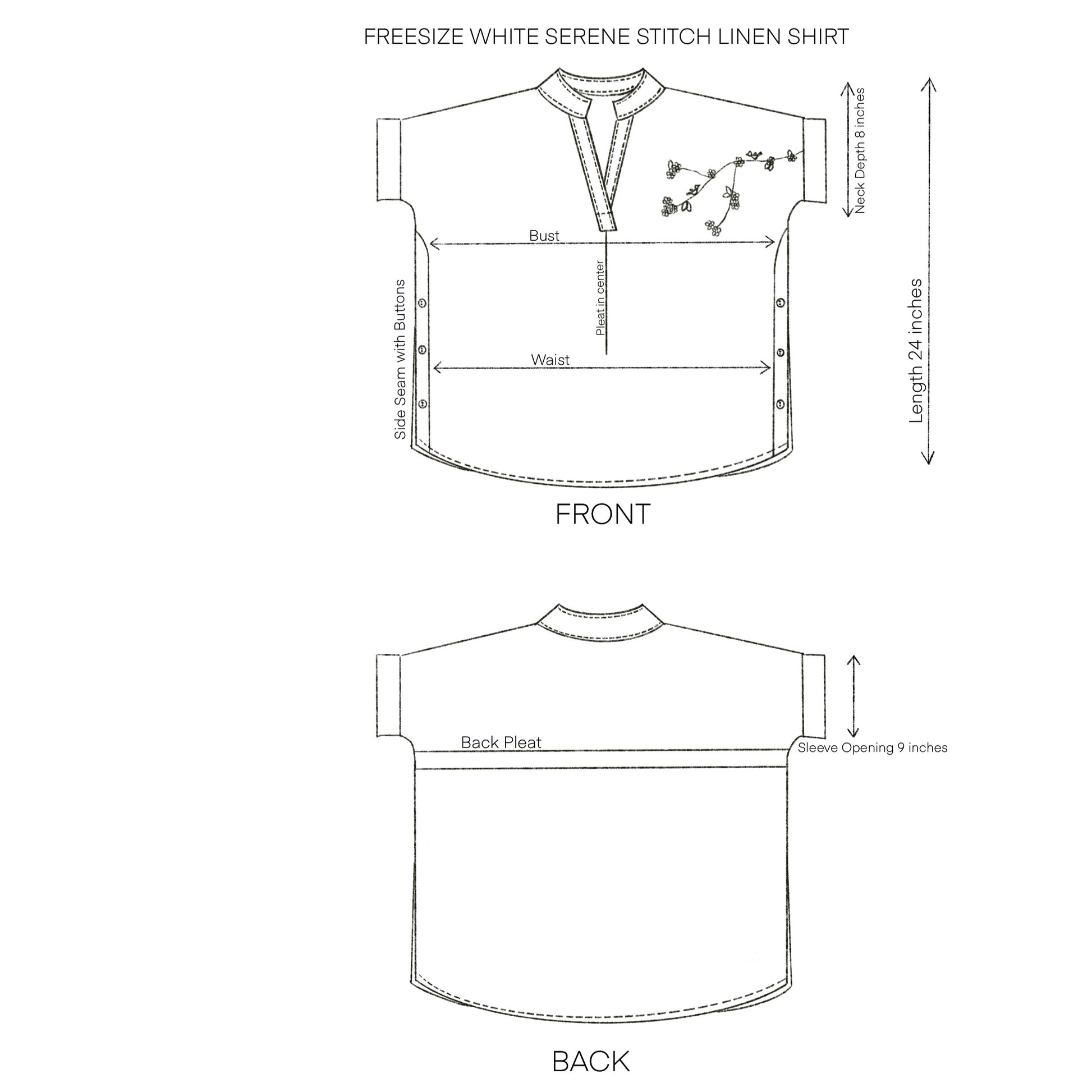 Discover effortless sophistication with the Freesize White Serene Stitch Linen Shirt. Crafted from premium linen, this oversized shirt features a V-neck and a front placket, adorned with delicate crochet details of flowers, leaves, and a bird. Its free-size fit offers relaxed comfort and versatile styling options.
