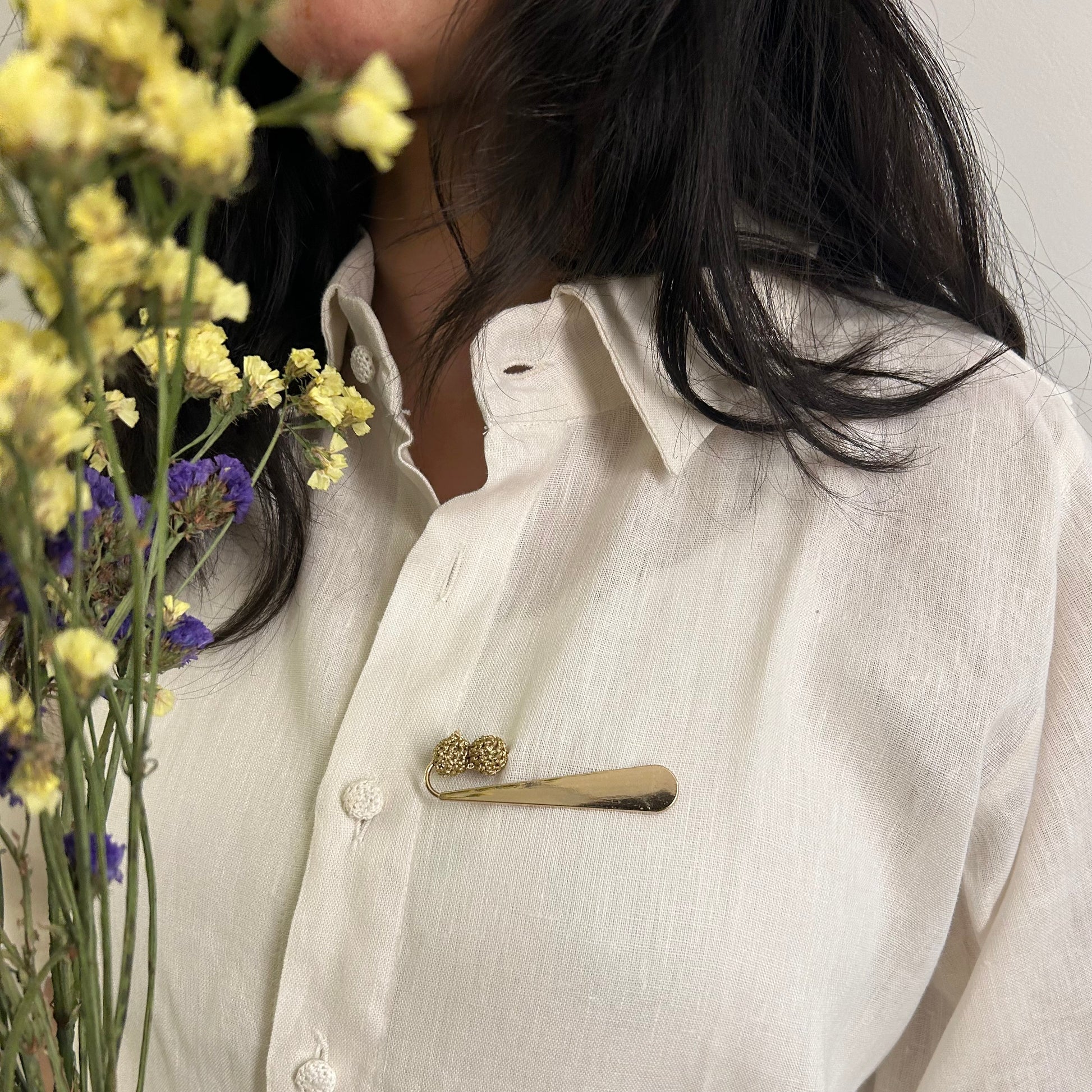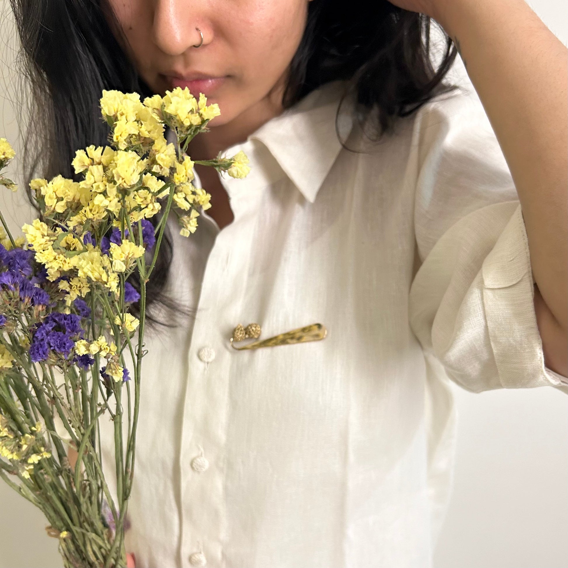 Enhance your style with the Golden Beads Crochet Brooch by Ikriit'm, a delightful blend of elegance and whimsy. This handmade accessory showcases beautifully crocheted golden zari beads on a metal pin. Perfect for brightening up any outfit, this brooch adds a charming touch to your jacket, dress, or bag. Each piece reflects Ikriit'm's dedication to fine craftsmanship and timeless design. Elevate your look with this captivating floral brooch, a perfect gift for yourself or a loved one.