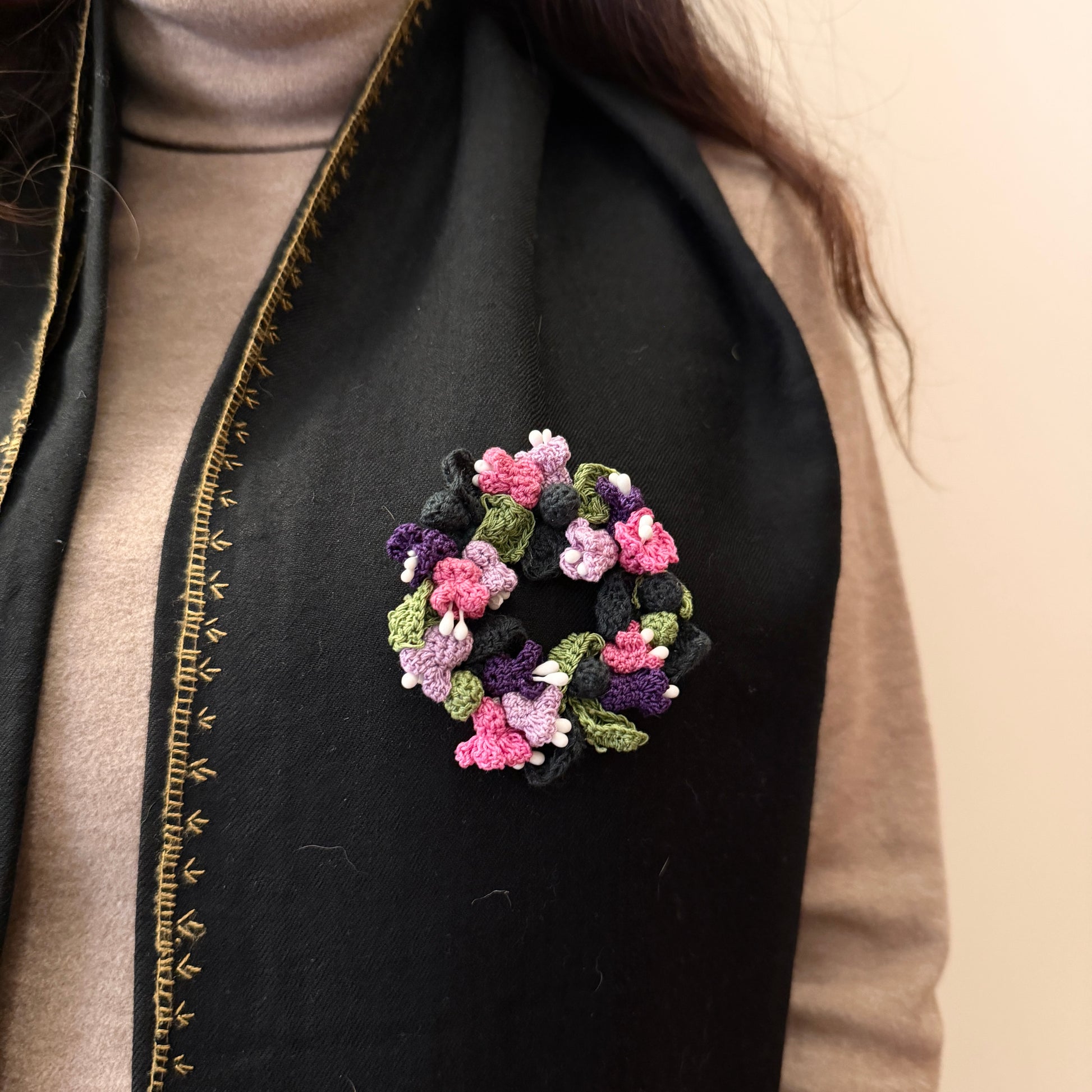Deep purple tulips take form in this delicately handcrafted brooch, brought together with fine crochet work and soft contrast at the centre. Each tulip is detailed with white filament accents at the centre, creating a gentle highlight against the rich purple petals. Paired with subtle crochet leaves, all elements are carefully stitched onto a metal ring base and finished with a metal pin at the back for secure, easy wear.