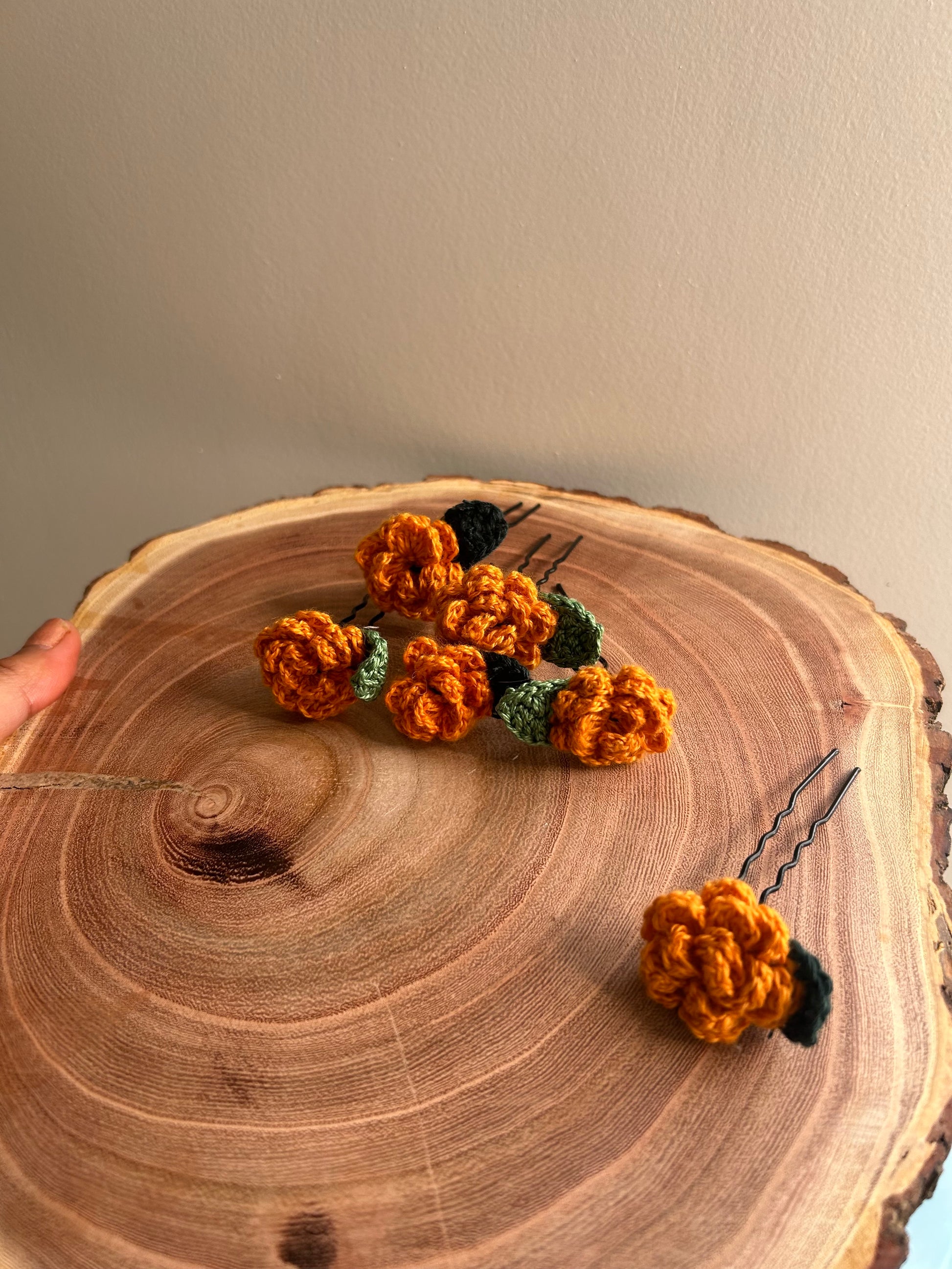 Crafted with meticulous attention to detail, each hairpin features intricately crocheted marigold flowers in a radiant shade of orange. Whether you're channeling bohemian chic at a music festival or adding a playful touch to your everyday look, these hairpins are sure to turn heads and elevate your style.