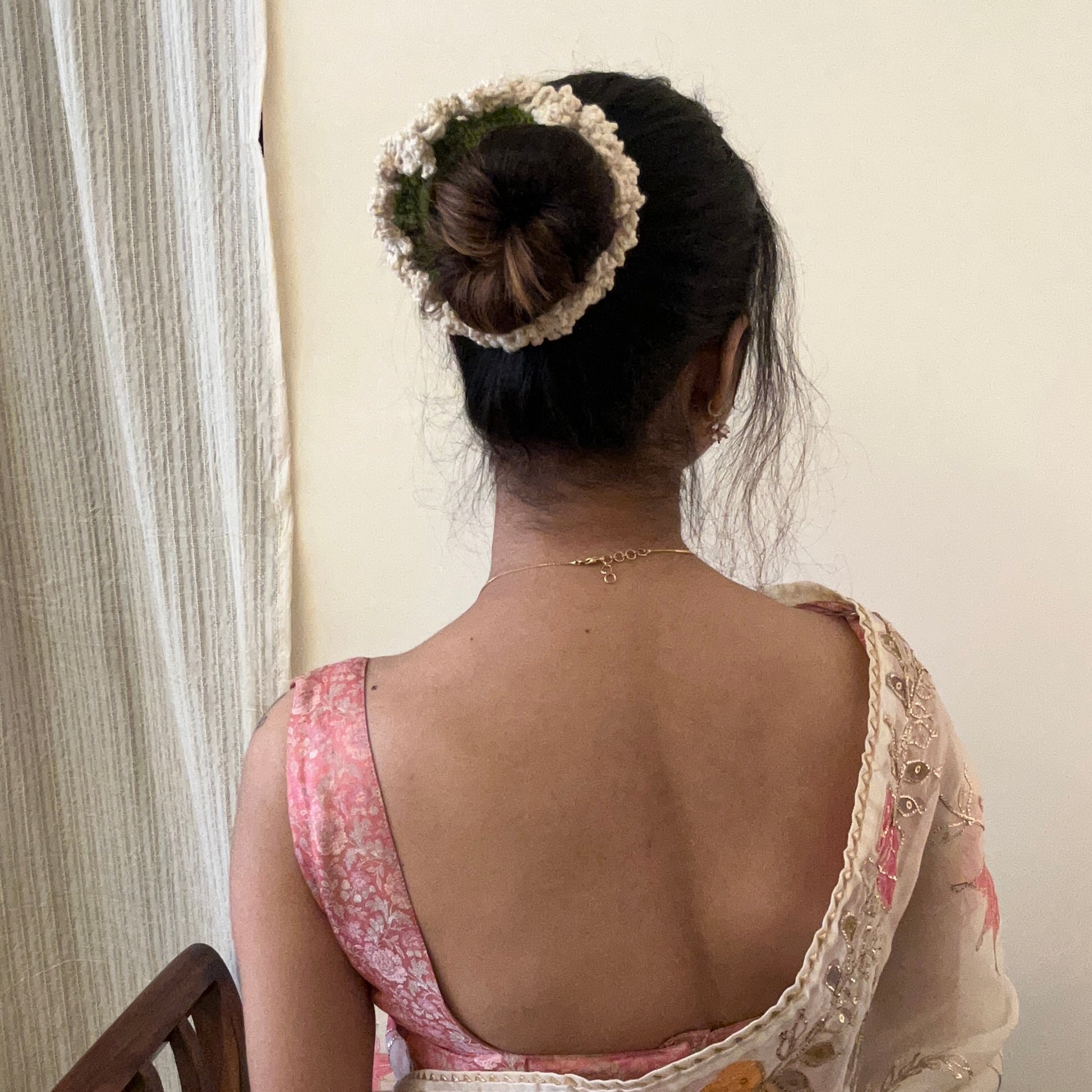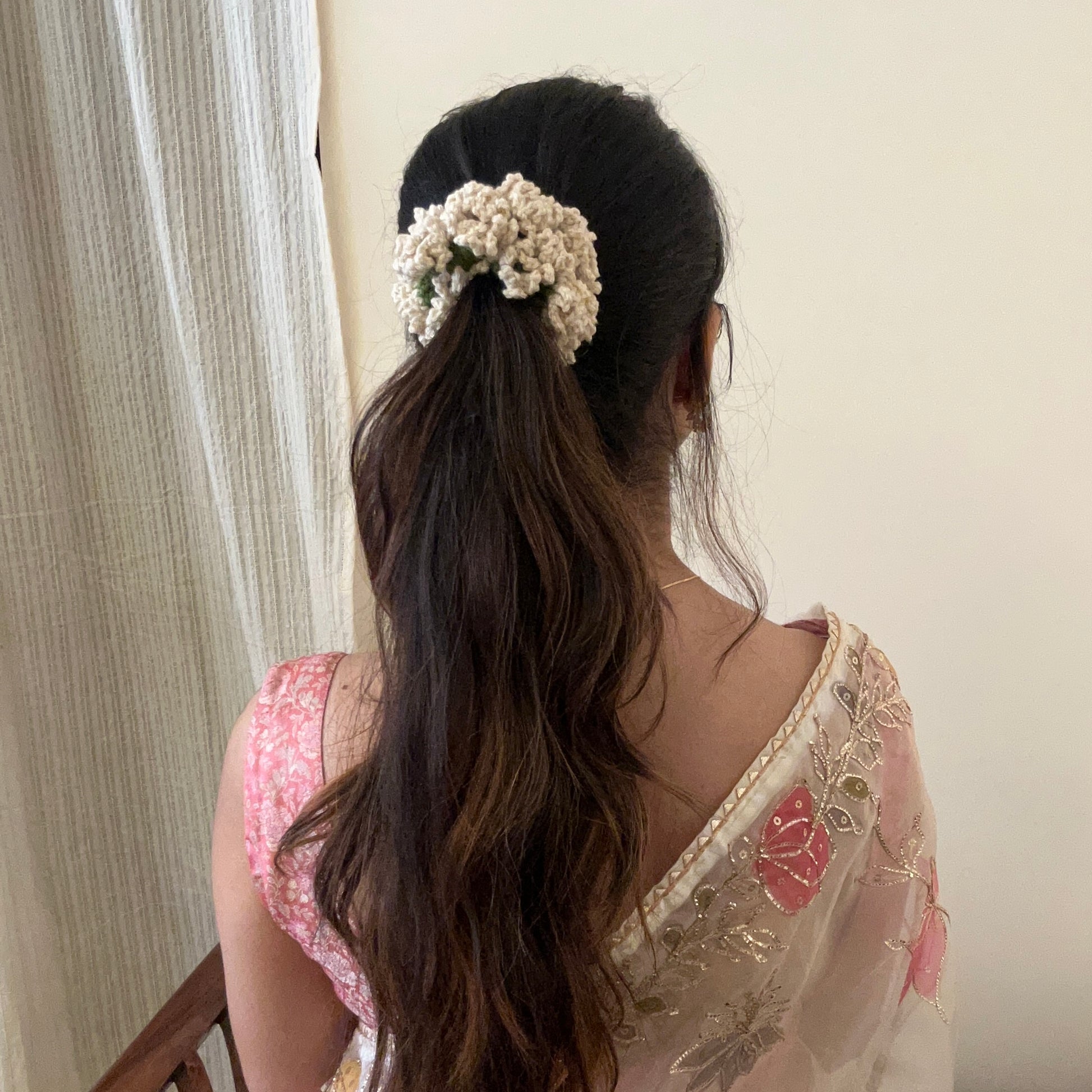 A delicate hand-crocheted off-white scrunchie inspired by the elegance of traditional flower gajras—subtle, timeless, and rooted in nostalgia.