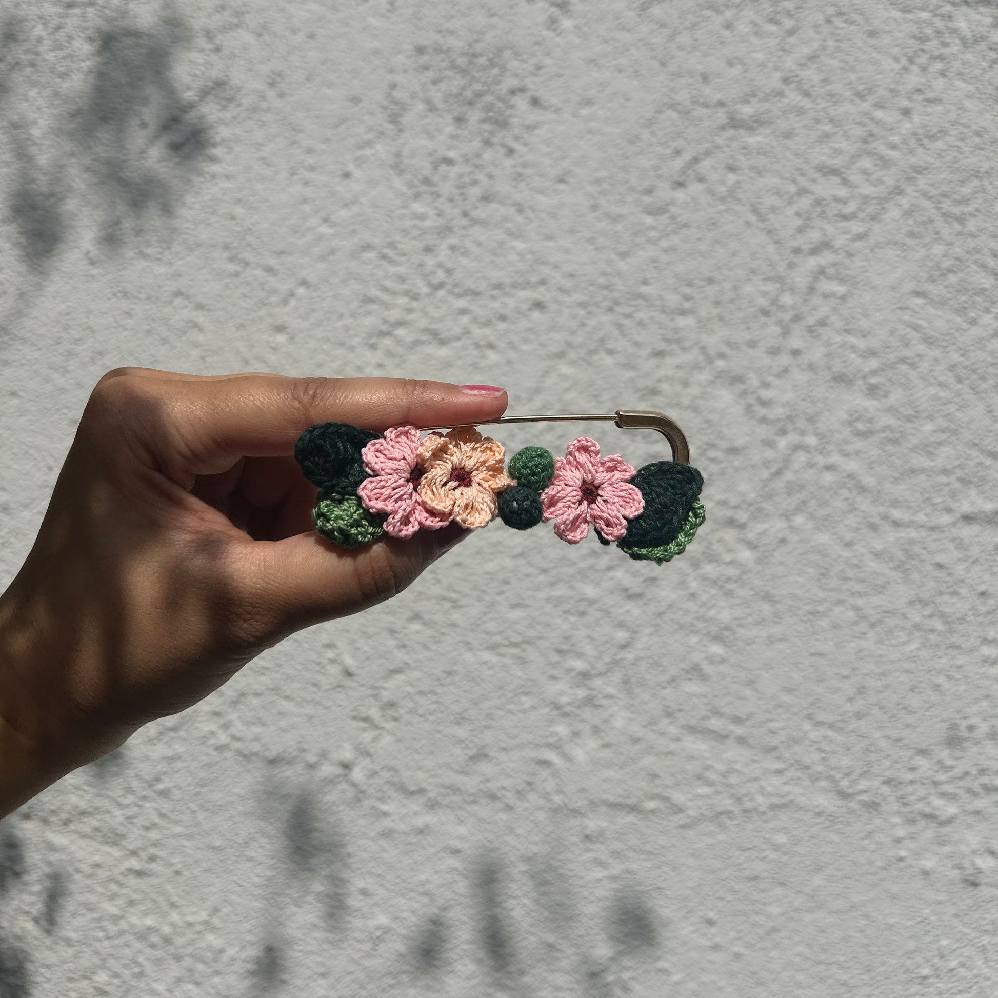 Enhance your style with the Floral Crochet Brooch by Ikriit'm, a delightful blend of elegance and whimsy. This handmade accessory showcases delicate pink and peach flowers, beautifully crocheted and accented with lush green leaves. Perfect for brightening up any outfit, this brooch adds a charming touch to your jacket, dress, or bag. Each piece reflects Ikriit'm's dedication to fine craftsmanship and timeless design. Elevate your look with this captivating floral brooch, a perfect gift for yourself or a loved one.