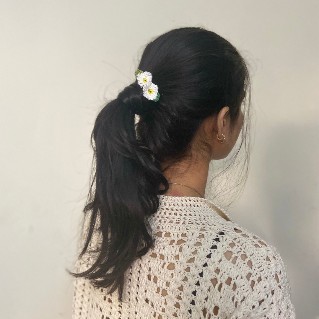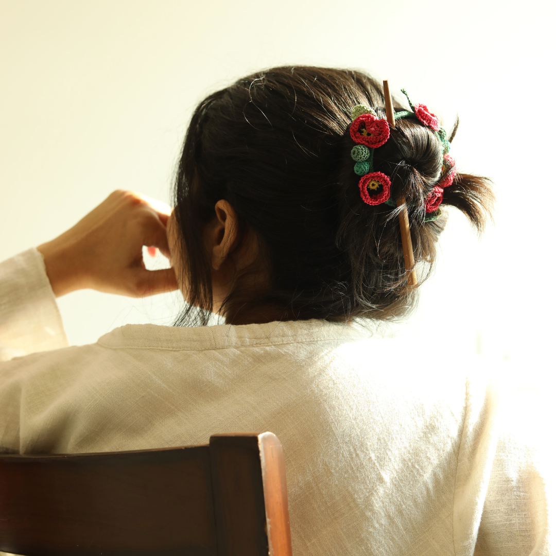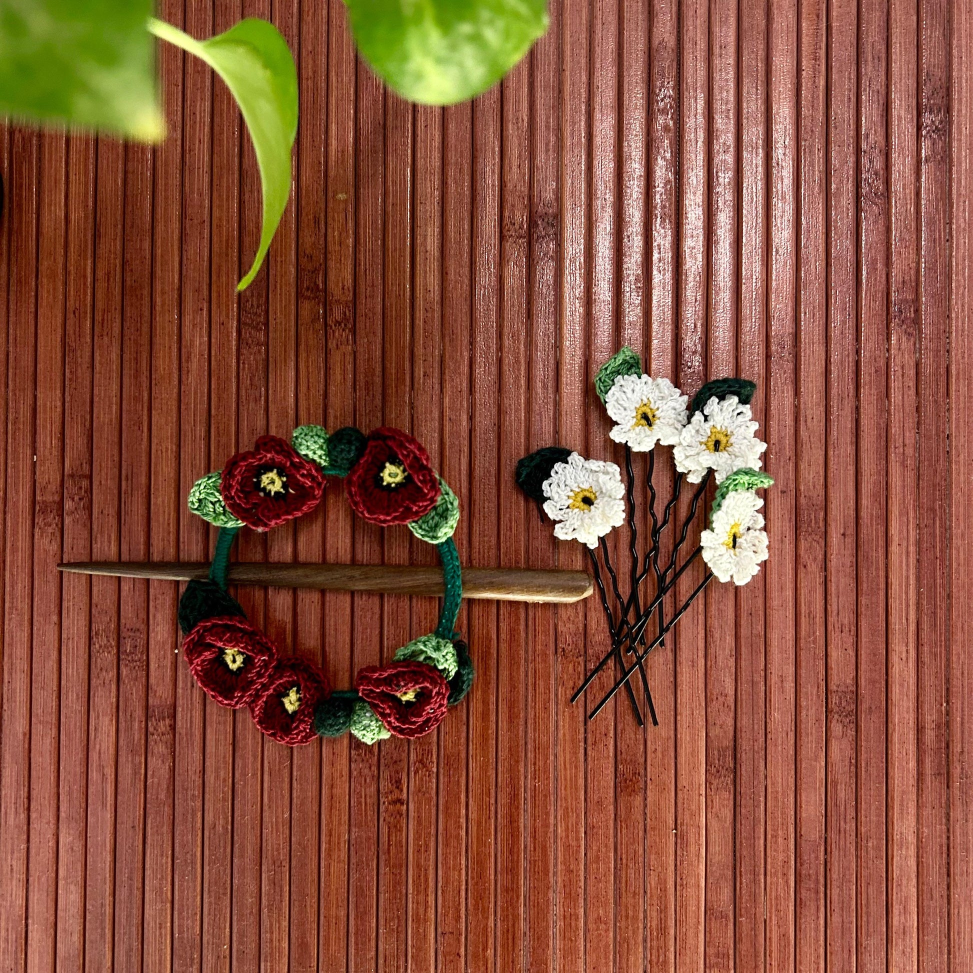 - Poppy Crochet Hair Tie: Crafted with meticulous attention to detail, this whimsical hair tie captures the essence of delicate poppy flowers, infusing your hairstyle with a touch of bohemian allure.