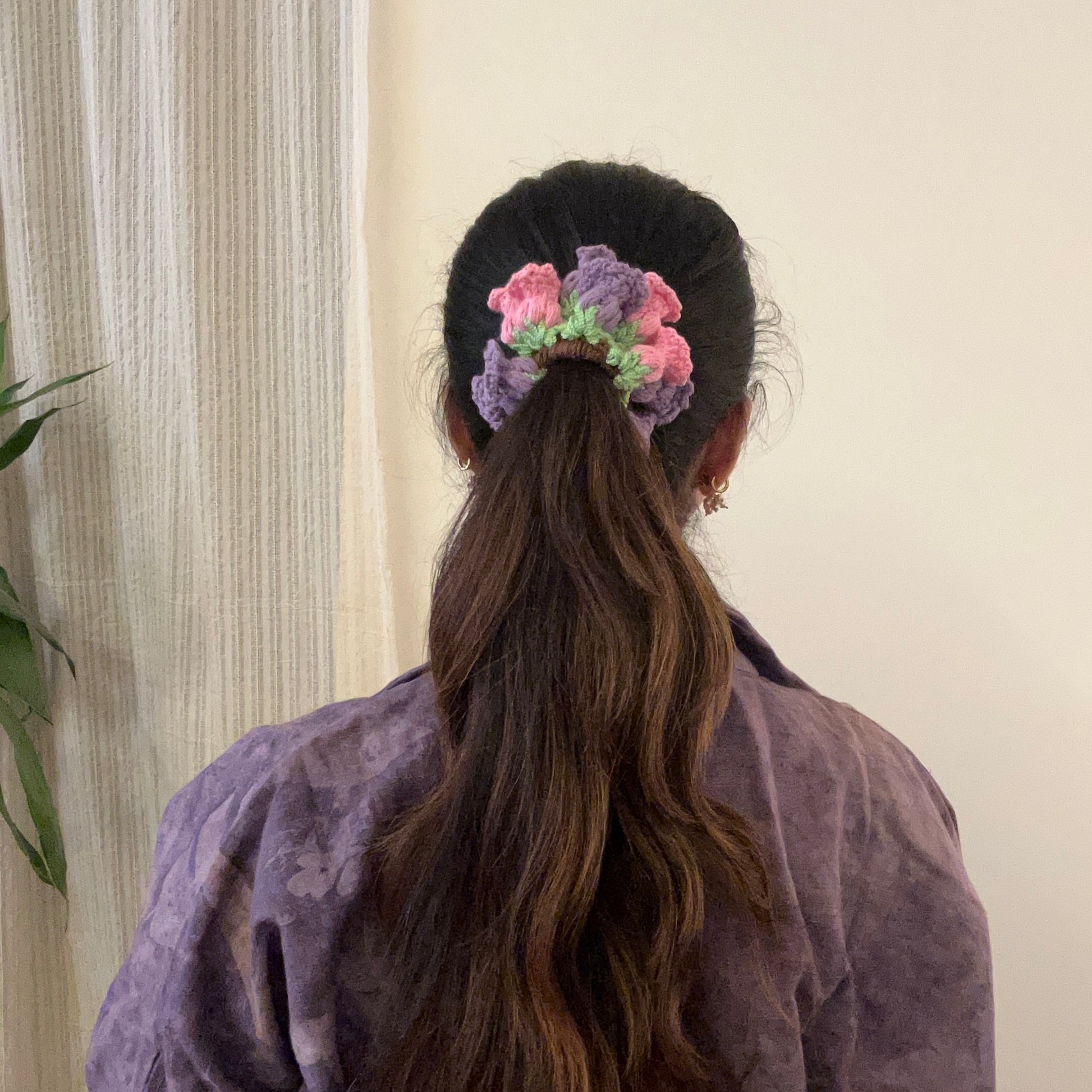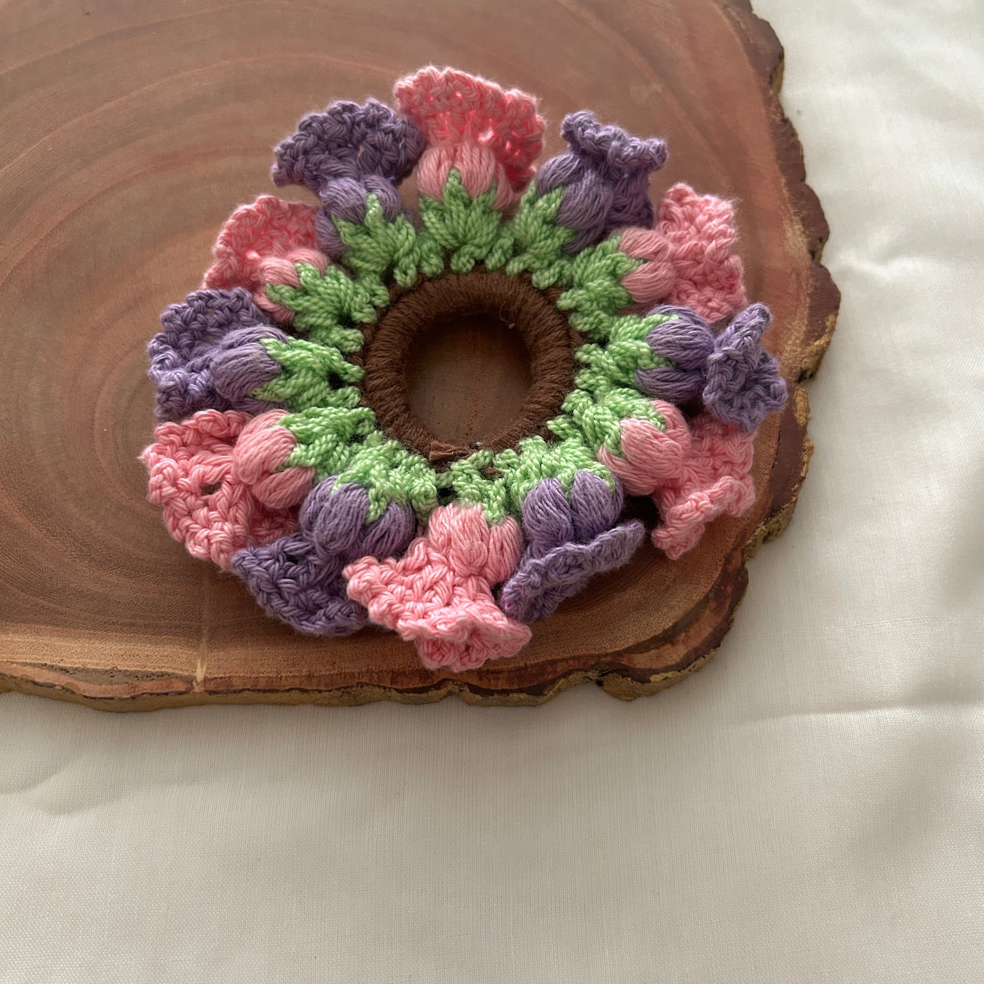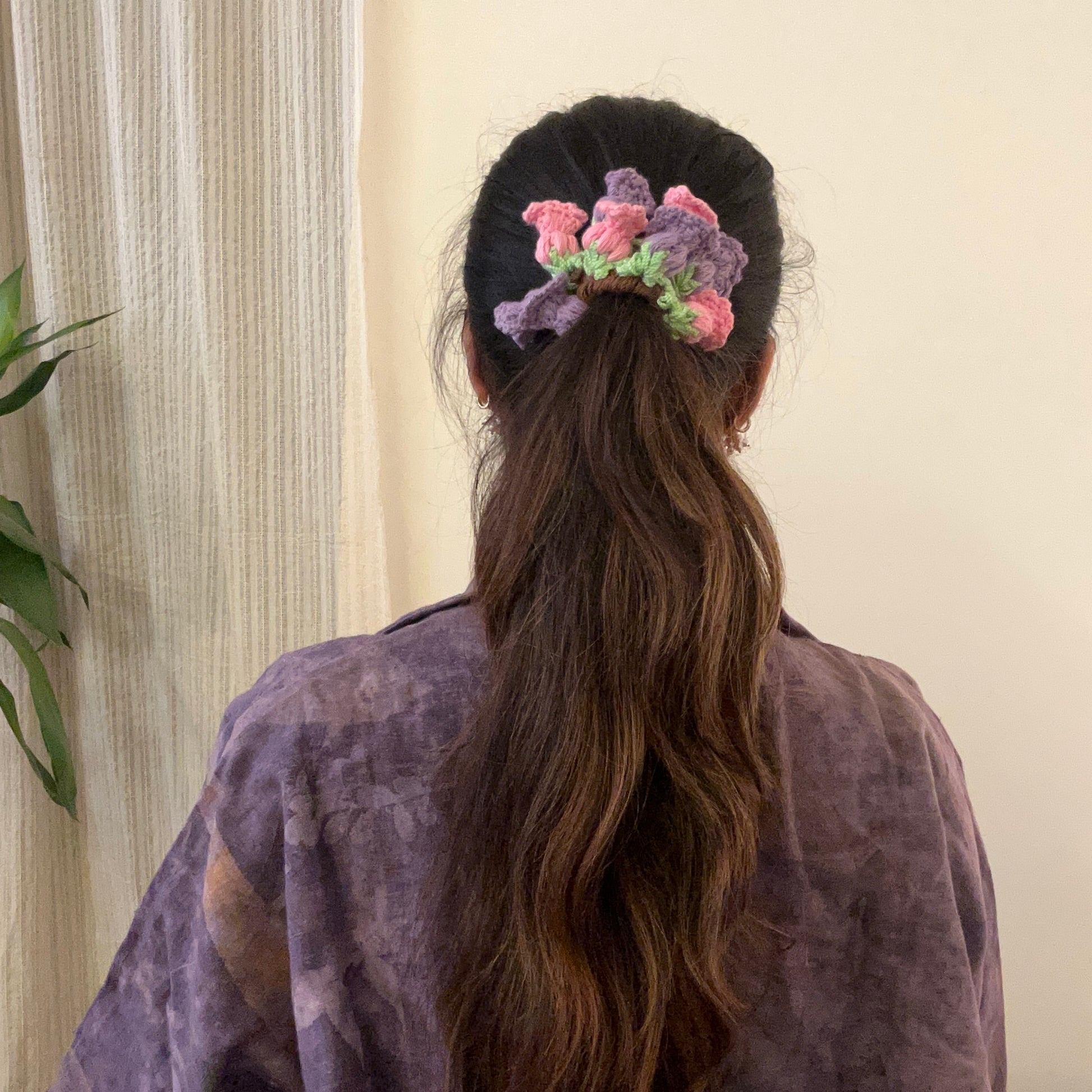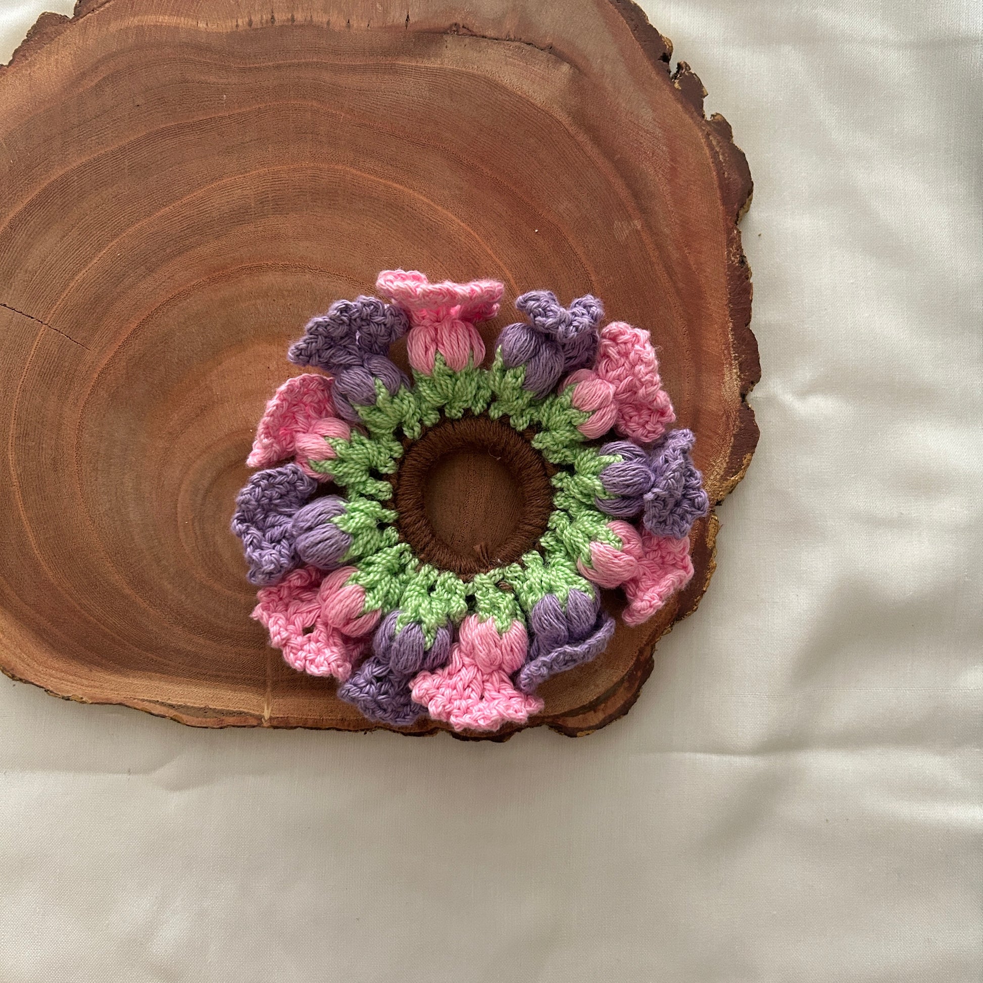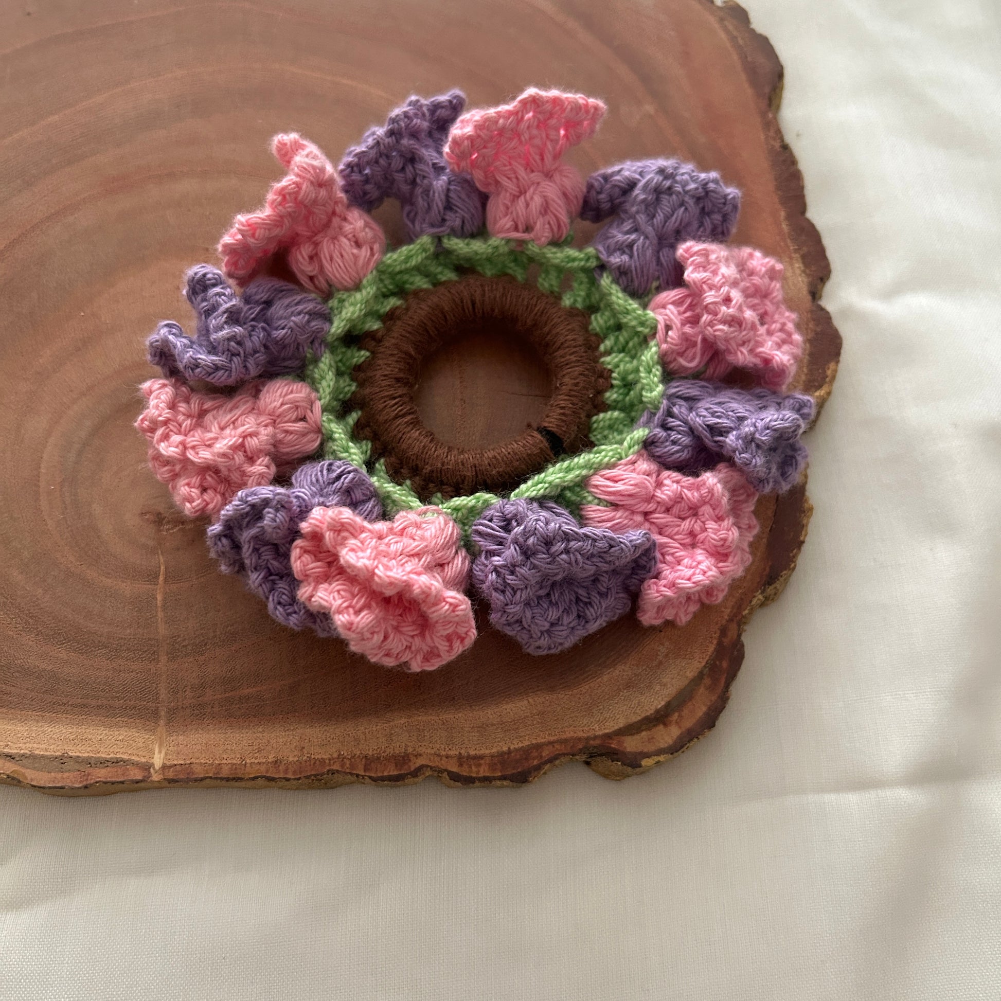 A hand-crocheted scrunchie with tiny tulip-like flowers in pink and purple—playful, delicate, and inspired by traditional flower gajras.