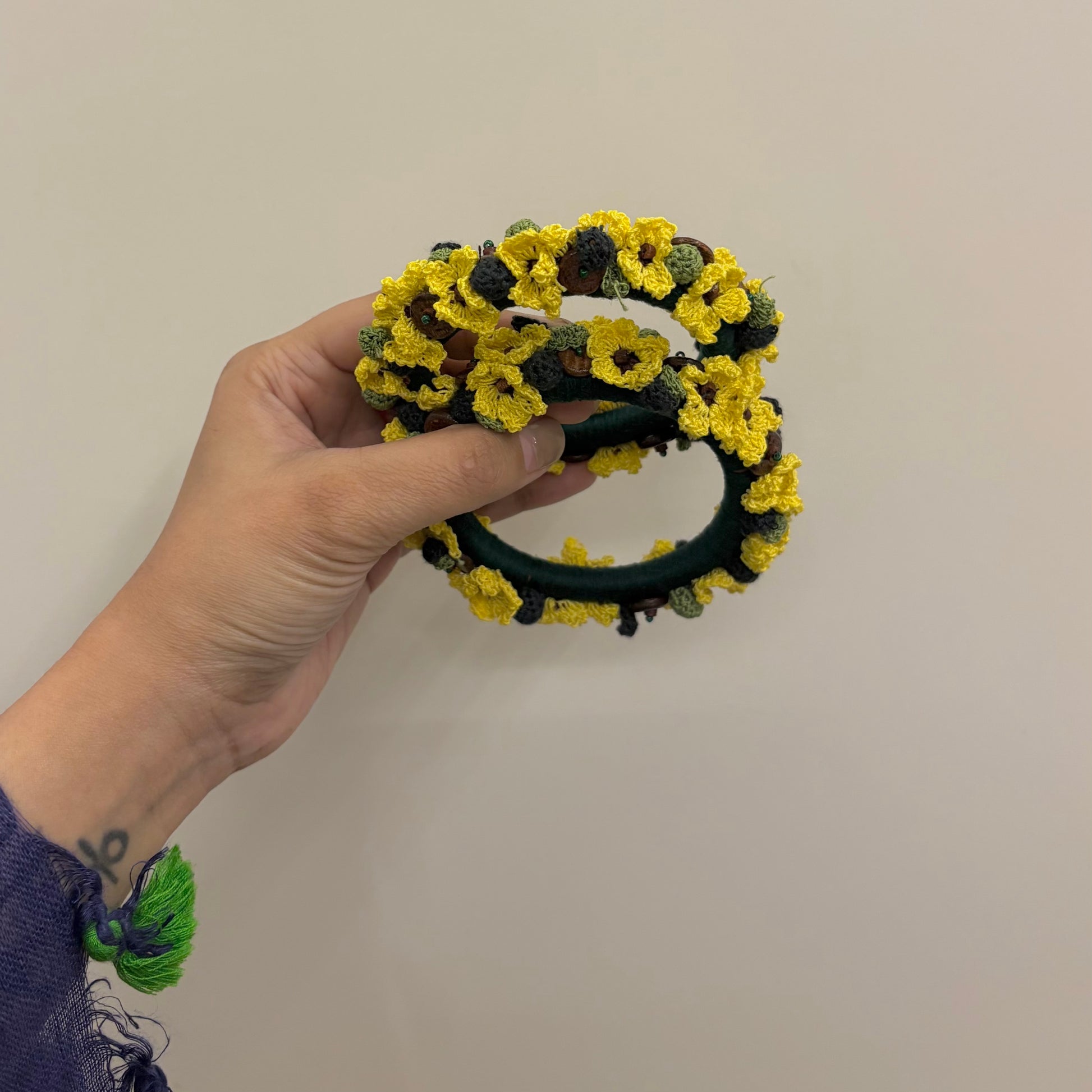 Bright, joyful, and crafted with care β these sunflower bangles bring a little summer to your wrists. Made on a sturdy rosewood base, each bangle features hand-crocheted sunflowers, soft crochet leaves, and bead details that add texture and charm. Wooden beads lend an earthy warmth, grounding the vibrant blooms with a natural touch.