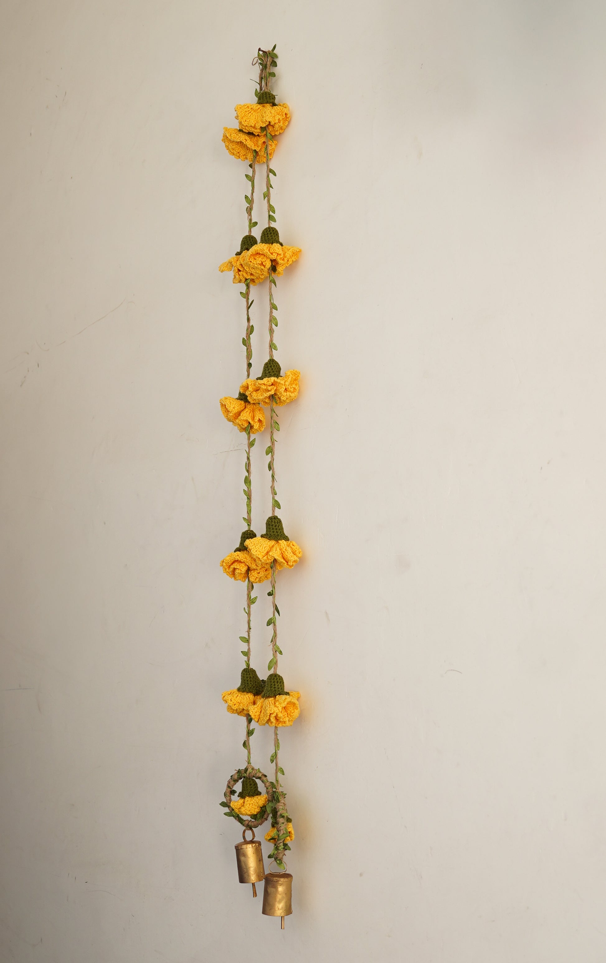 Celebrate the season of lights with handmade beauty that lasts beyond the festivities. This decor hanging brings together crochet marigold flowers on sturdy jute yarn, finished with a brass bell that adds a gentle, traditional chime. A loop at the top makes it easy to hang on doors, walls, or windows, filling your home with festive warmth and charm.