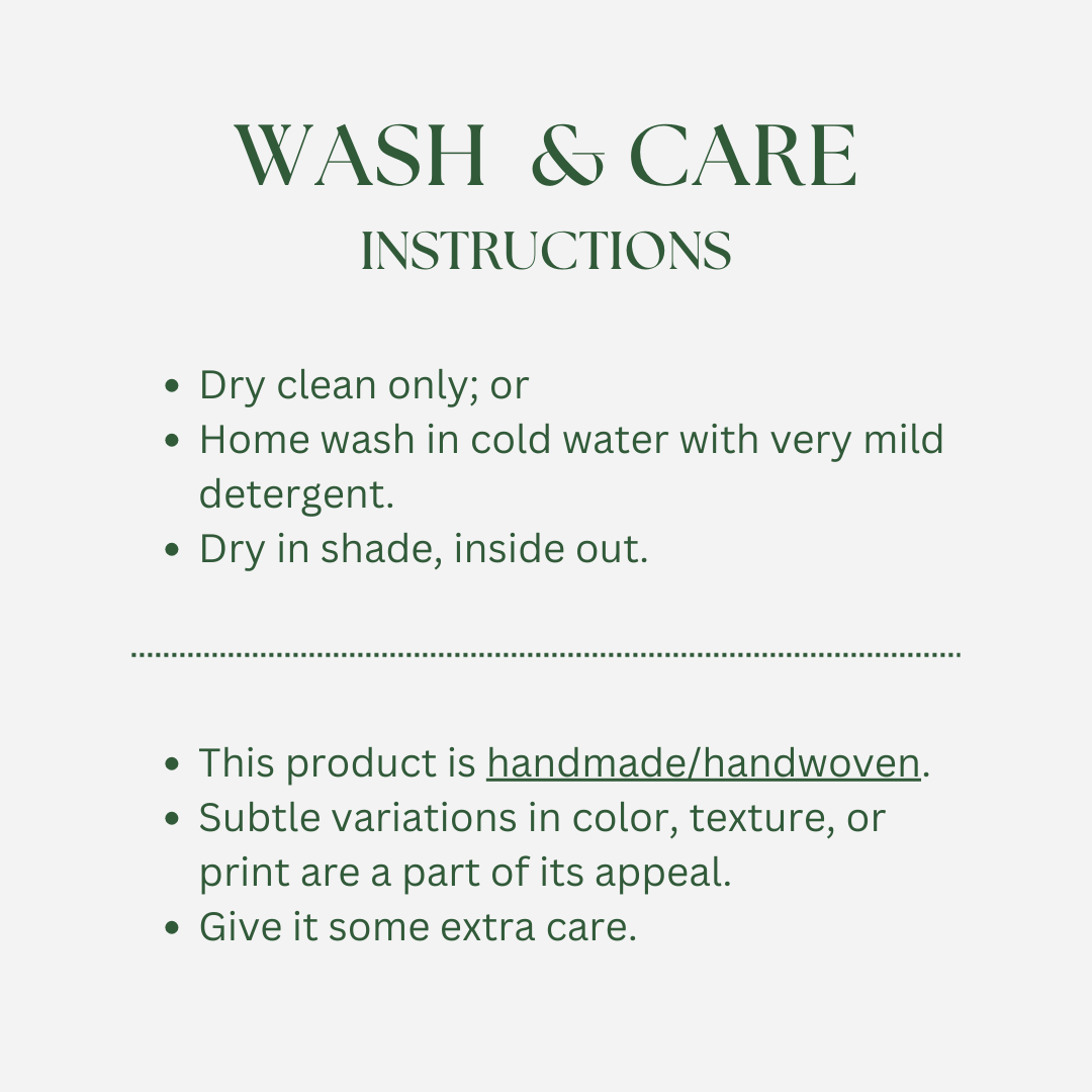 This product is handmade/handwoven. Subtle variations in color, texture, or print are a part of its appeal. Give it some extra care. Dry clean only/Home wash in cold water with very mild detergent. Dry in shade, inside out.
