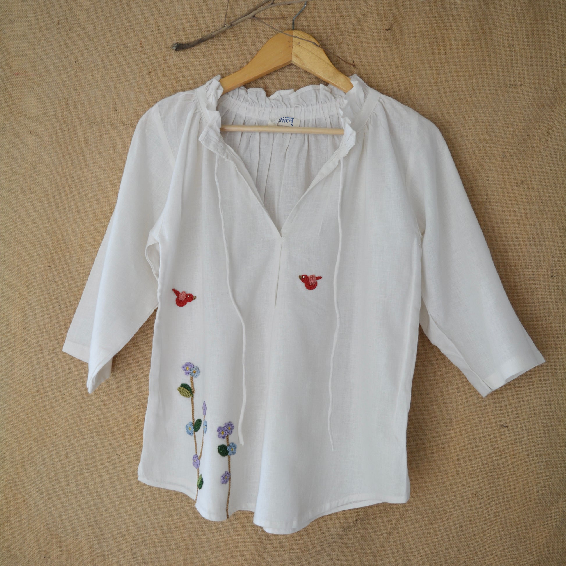 Elevate your style with the White Serene Stitch Linen Top. Crafted from premium linen, this top features a round neck with gathered details and a string for a refined touch. The 3/4th sleeves are adorned with delicate crochet details of flowers, leaves, and a bird, making it a versatile and elegant addition to your wardrobe.