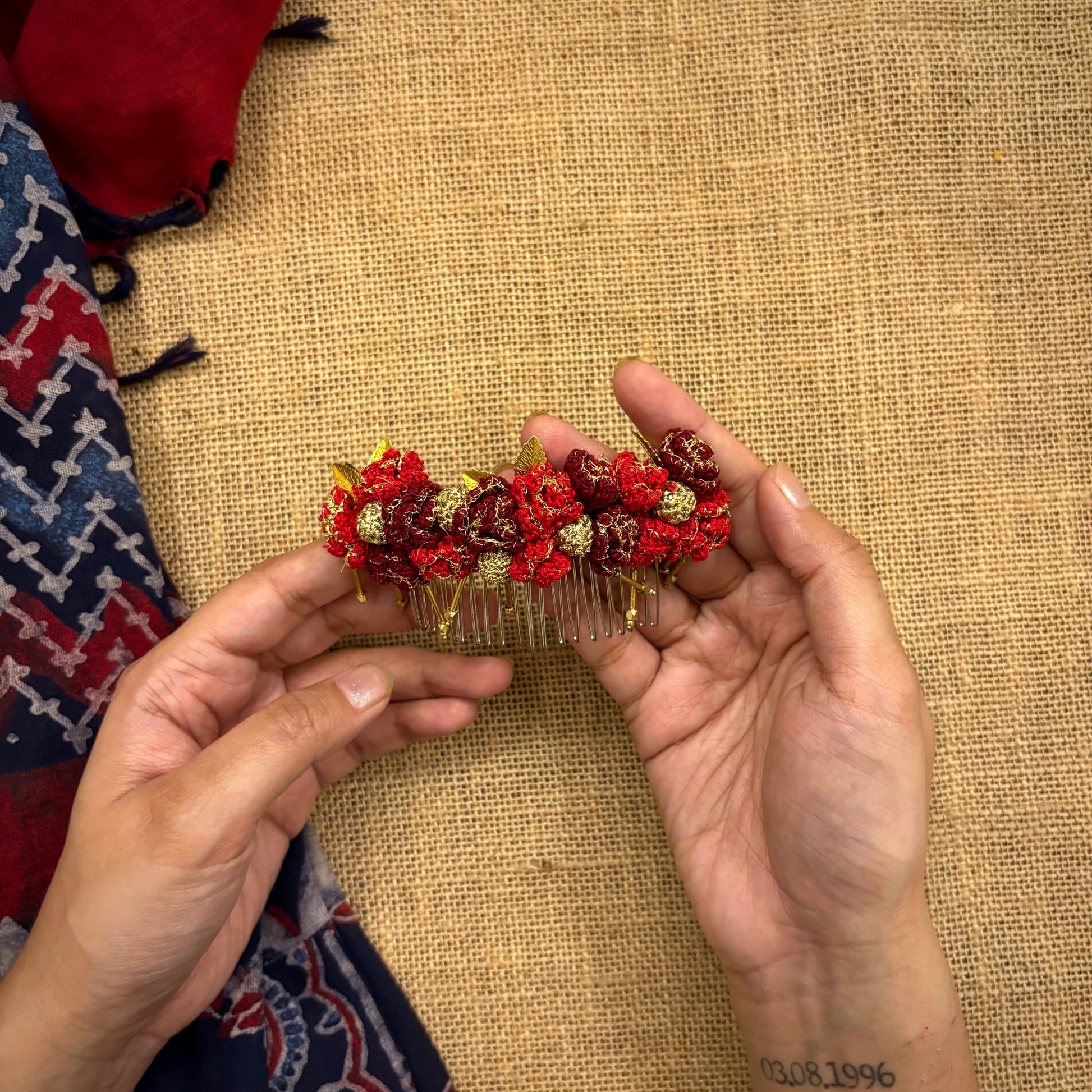 The Rose Zari Hair Comb is a quiet bloom of craft and shimmer — crochet roses made by combining golden zari with brass leaves, each petal shaped by hand and set with care. The piece carries a gentle gleam, perfect for festive hairdos or moments that call for a hint of gold.